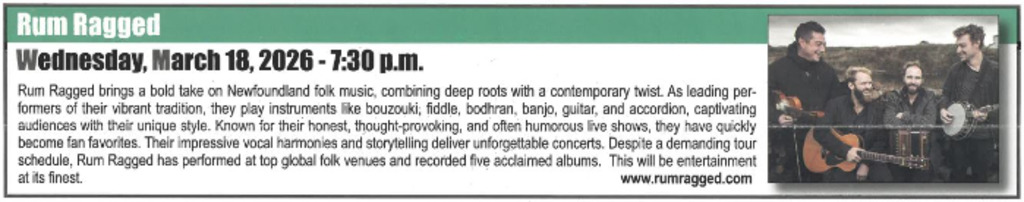 Rum Ragged brings a bold take on Newfoundland folk music, combining deep roots with a contemporary twist. As leading performers of their vibrant tradition, they play instruments like bouzouki, fiddle, bodhran, banjo, guitar, and accordion, captivating audiences with their unique style. Known for their honest, thought-provoking, and often humorous live shows, they have quickly become fan favourites. Their impressive vocal harmonies and storytelling deliver unforgettable concerts. Despite a demanding tour schedule, Rum Ragged has performed at top global folk venues and recorded five acclaimed albums. This will be entertainment at its finest.