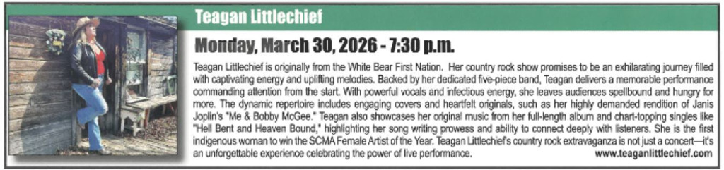 Originally from White Bear First Nation, Teagan's country rock show promises to be an exhilarating journey filled with captivating energy and uplifting melodies. Backed by her dedicated five-piece band, Teagan delivers a memorable performance commanding attention from the start. Her repertoire includes covers and heartful originals like chart-topping "Hell Bent and Heaven Bound" that showcases her songwriting prowess. Teagan is the first Indigenous woman to earn the SCMA Female Artist of the Year award.