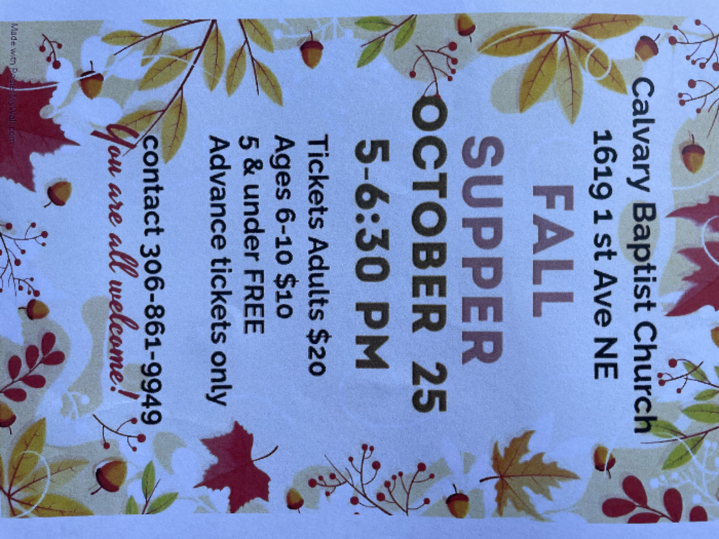 Fall Supper at Calvary Baptist Church, Saturday, October 25 five to 6:30 PM. Adult tickets $20 Children 6 –10 $10, 5 and under free.