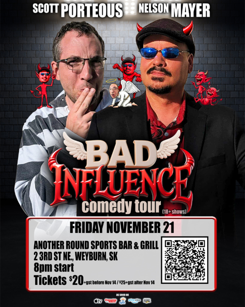 Get ready for a night of laughter, mischief, and pure comedic chaos as Scott Porteous and Nelson Mayer bring the Bad Influence Comedy Tour to Another Round Sports Bar and Grill in Weyburn!
