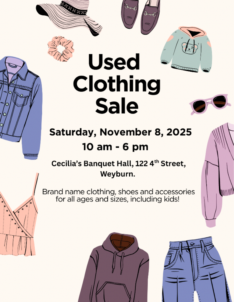 10 different vendors with all kinds of name brand womens, men's, and children's clothing and accessories for sale at Cecelia's Hall (122 - 4th street) in Weyburn from 10am- 6pm Saturday Nov 8