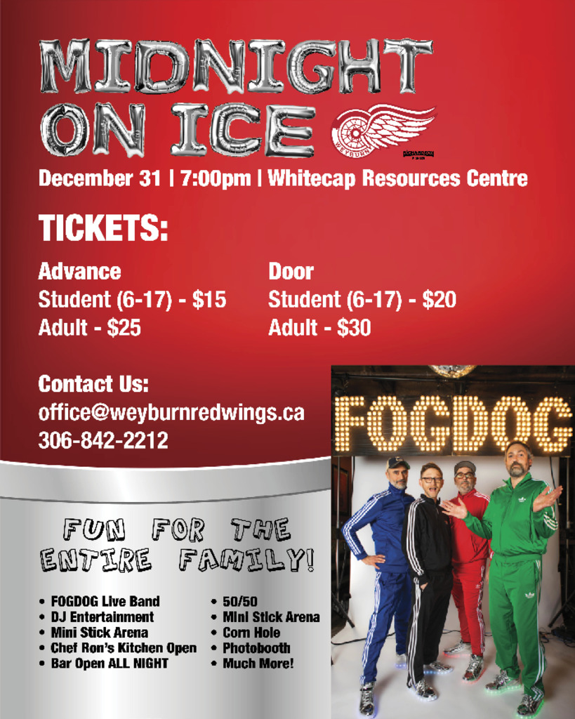 Join us December 31 as we turn the Whitecap Resources Centre into a full New Year celebration β with the ice fully covered for a huge on-ice party!