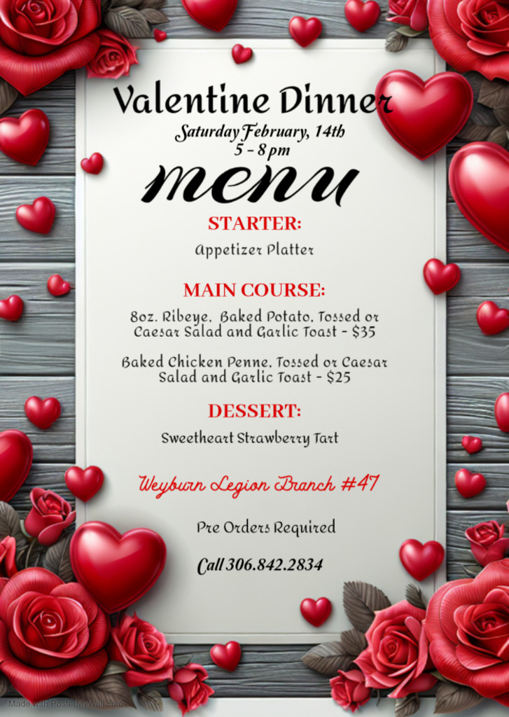 The legion is taking reservations for our Valentine's Day Dinner featuring an 8oz ribeye or baked chicken penne. Call 306-842-2834 to order and reserve your Valentine's Day Dinner at the Legion to be served between 5 p.m. and 8 p.m.