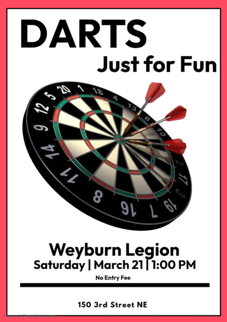 The Weyburn Legion hosts free, fun Darts! The boards are set and the darts are sharp! Head down to the Weyburn Legion Saturday March 21st at 1 p.m. for this fun, free afternoon of darts, whether you're a seasoned player or a beginner, the excitement of hitting the bull is the same!