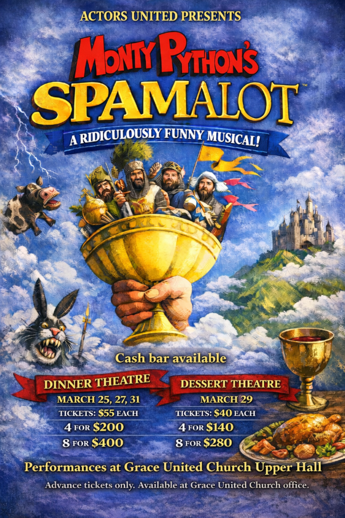 Actors United will be presenting the musical Spamalot at Grace United Church on March 25, 27, 29, and 31. It features local some exceptional local talent who will be sure to have you laughing for the whole show!