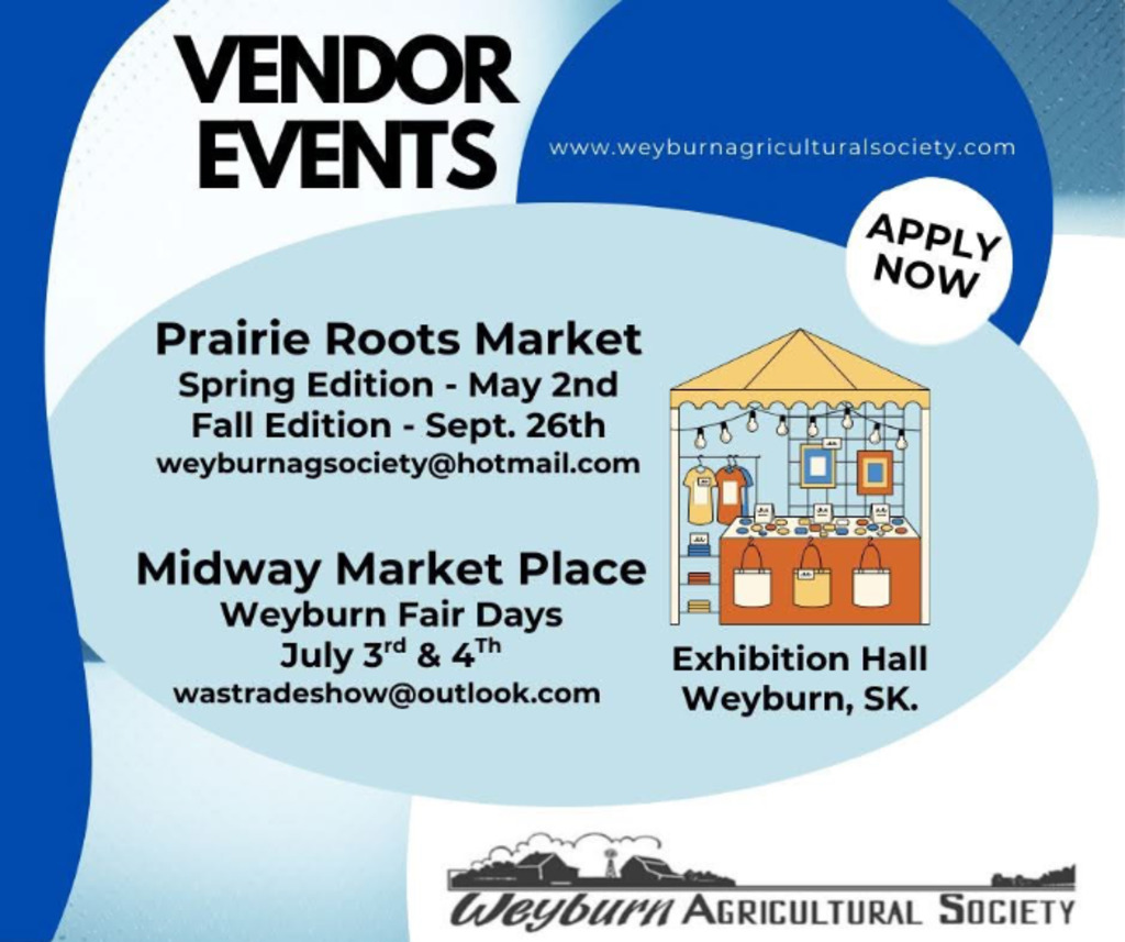 Weyburn Agricultural Society is pleased to present the 1st annual Spring Edition of the Prairie Roots Market. Join us in Exhibition Hall on May 2, 2026 from 10 AM to 4 PM where you will find a variety of bakers, makers, and small business showcasing their wares.